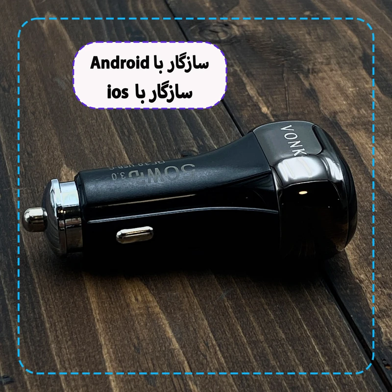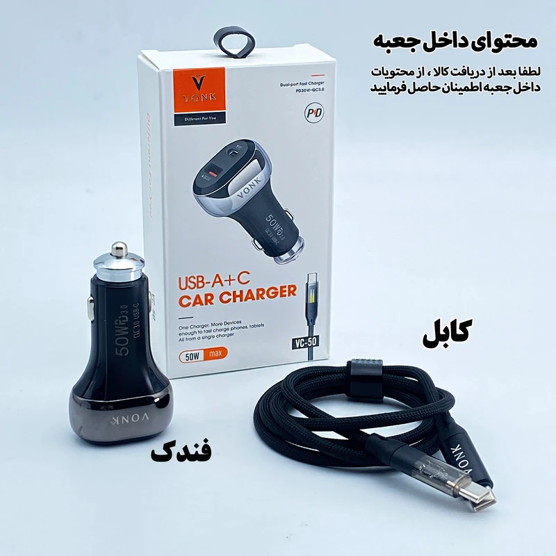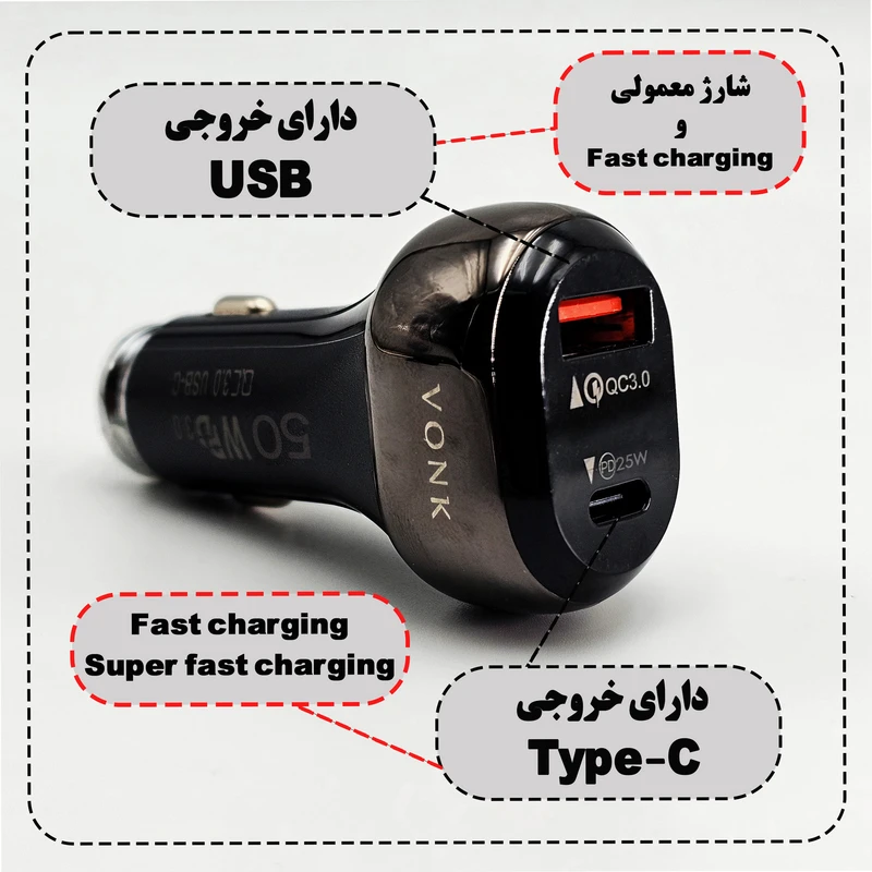 شارژر فندکی VC-50 از برند VONK این محصول جدید و باکیفیت، محصول در سال 2025 طراحی شده است و تمام بروزرسانی های گوشی های جدید سازگاری دارد ( iOS و Android ) و قابلیت شارژ معمولی ، شارژ سریع(Fast Charging) و شارژ خیلی سریع (Super Fast Charging ) و به شما امکان می‌دهد تا متناسب با نیازتان استفاده کنید ، این فندکی دارای دو خروجی Type-C و USB هست و یک کابل یک متری LED دار Type-C هم داخل جعبه وجود دارد.شارژر فندکی VC-50 از برند VONK این محصول جدید و باکیفیت، محصول در سال 2024 طراحی شده است و تمام بروزرسانی های گوشی های جدید سازگاری دارد ( iOS و Android ) و قابلیت شارژ معمولی ، شارژ سریع(Fast Charging) و شارژ خیلی سریع (Super Fast Charging ) و به شما امکان می‌دهد تا متناسب با نیازتان استفاده کنید ، این فندکی دارای دو خروجی Type-C و USB هست و یک کابل یک متری LED دار Type-C هم داخل جعبه وجود دارد.
